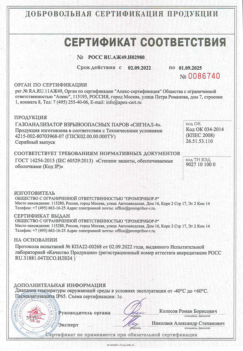 Технические характеристики газоанализатора Сигнал-4: