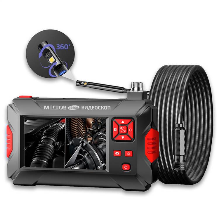 Цифровой видеоскоп МЕГЕОН 33600 с полужёстким зондом длиной 5 метров и поворотным блоком камер, управляемым с панели.