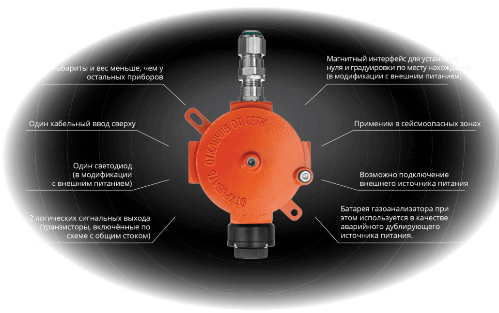 – токовая петля (пассивная) – RS-485 – 2 транзистора (включенные по схеме с общим эмиттером) для сигнализации превышения установленных порогов концентрации анализируемого газа с помощью логических уровней напряжения – световая индикация |
