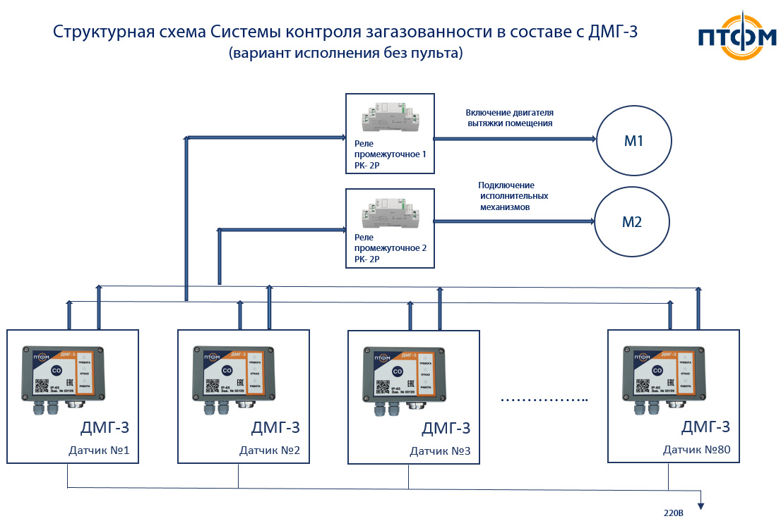 Для осуществления контроля предельно – допустимых концентраций оксида углерода (СО) в закрытых независимых автопарковках используется решение на базе сети RS-485 детектора моногаза ДМГ-ОУ, реле типа РК-2Р, источника питания, устройств сопряжения УС-485 и пульта ПВУ-80, который имеет звуковую и светодиодную индикацию, служит для оповещения дежурного персонала о превышении заданных пороговых значений анализируемых веществ или о возникновении неисправности в системе.